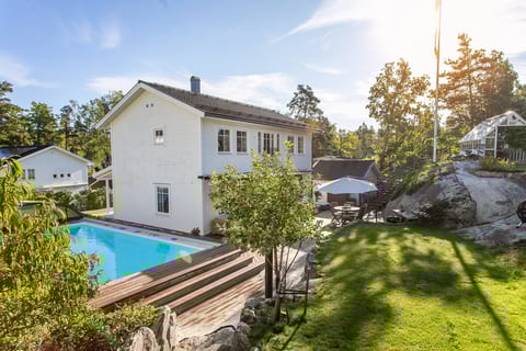 Klassisk dröm i modern tappning på underbar tomt med pool