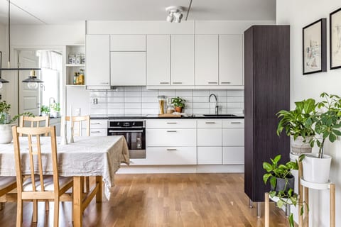 Köket är stilrent och praktiskt. Gott om förvaring bakom släta skåpsluckor och stora arbetsytor som gör matlagningen både enkel och inspirerande. Här finns plats för hela familjen att samlas kring middagsbordet. Köket smälter samman med vardagsrummet och utgör hemmets samlingspunkt. Från vardagsrummet nås en stor och solig balkong - perfekt för avkoppling under varma dagar och kvällar. Dessutom finns ytterligare en balkong i ett lugnt läge mot innergården, en perfekt plats för morgonkaffet i dagens första solstrålar.