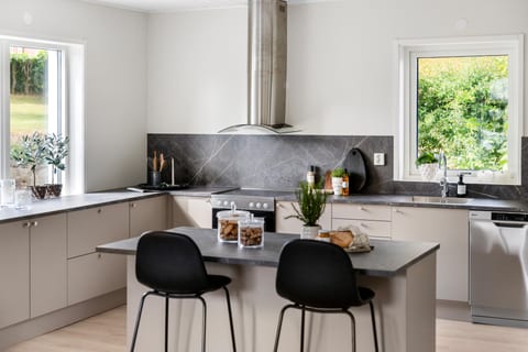 Huset har en boarea om ca 125 kvm – smart planerat och känns betydligt större tack vare sin genomtänkta planlösning och luftiga rum. På entréplan finns en stor praktisk hall, helkaklat badrum med dubbelhandfat och dusch och ett så snyggt kök från HTH med generösa ytor och gott om plats för både matlagning och umgänge. Vardagsrummet ligger i vinkel, med stort ljusinsläpp och en stämningsfull kamin som blir rummets naturliga mittpunkt.