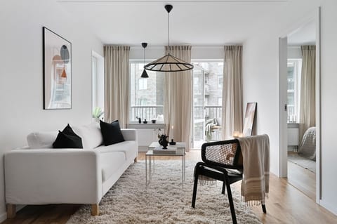Lägenheten är smakfullt inredd med högkvalitativa materialval i harmoniska kulörer, och det vackra genomgående trägolvet ger en varm och inbjudande känsla. Det välutrustade köket är en dröm för den matlagningsintresserade. Här finner du påkostade vitvaror, inklusive kyl och frys, ugn och mikro, diskmaskin och induktionshäll med fläkt. Det finns även plats för en matgrupp för 4-6 personer, perfekt för trevliga middagar med familj och vänner.