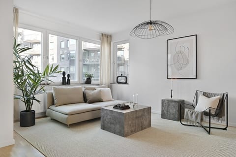 Lägenheten är smakfullt inredd med högkvalitativa materialval i harmoniska kulörer, och det vackra trägolvet ger en varm och inbjudande atmosfär. Det välutrustade köket, i en stilren beige ton, är en dröm för den matlagningsintresserade. Med påkostade vitvaror, inklusive kyl och frys, ugn och mikro, diskmaskin och induktionshäll med fläkt, har du allt du behöver för att skapa fantastiska måltider. Här finns även gott om plats för en matgrupp för 6–8 personer, perfekt för trevliga middagar och festliga tillfällen.