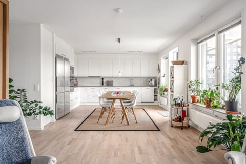 Bostaden är genomgående ljus och stilfull med öppen planlösning mellan kök och vardagsrum. Här finns tre rymliga sovrum med bra förvaringsmöjligheter samt två stilfulla toaletter. En WC med dusch och ett badrum som är utrustat med wc, dusch, tvättställ med kommod, speglar med inbyggd belysning, skåp för förvaring tvättmaskin och torktumlare. Hallen är ljus och välkomnande med avhängningsmöjligheter för ytterkläder och skor till vänster innanför dörren. Köket har goda arbets- och förvaringsmöjligheter och bred maskinell utrustning med b.la. dubbel kyl/frys, ugn, micro, diskmaskin, spis och spisfläkt. I direkt anslutning till köket finns plats för ett större matbord med tillhörande stolar. Vardagsrummet är välplanerat, ljust, luftigt och lättmöblerat. Här kommer man även ut till den fantastiska balkongen i soligt västerläge och med fri utsikt. Till bostaden tillhör även ett källarförråd.