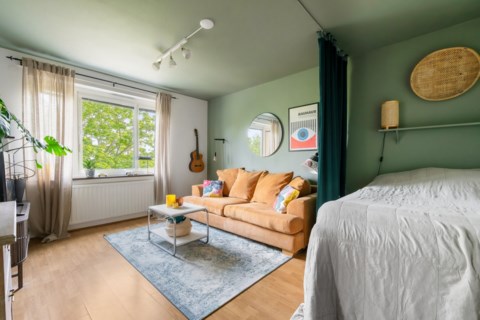 Lägenheten är genomgående ljus och harmonisk, med genomtänkta materialval och en planlösning som gör att ytorna känns både öppna och funktionella. Du välkomnas av en hall med platsbyggda garderober – här finns gott om plats för både ytterkläder och förvaring. Vidare kliver du in i allrummet, hjärtat av bostaden. Rummet badar i dagsljus från det stora fönstret, med utsikt över ett grönområde som skänker både lugn och avskildhet. Här ryms enkelt en soffa, säng och skrivbord – utan att du kompromissar med rymd eller komfort.