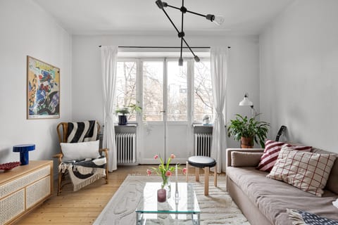 Vardagsrummet rymmer soffa, tv och tv-bänk, i vardagsrummet finns även en klädkammare för förvaring. Lägenheten präglas av den charmiga 30-talskaraktären med trägolv, generös takhöjd och fina tidstypiska dubbeldörrar till balkongen. Balkongen nås från vardagsrummet, på balkongen finns det plats för loungemöbler.