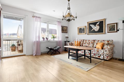 Högt upp i huset med inglasad balkong och hiss!