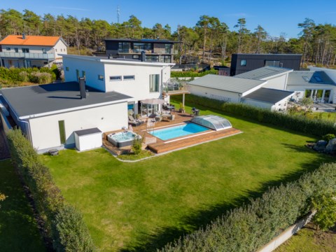 Detta moderna 2-planshus, byggt 2017–2018, ligger på en vackert anlagd tomt som erbjuder det bästa av utomhusliv. Här finner du en uppvärmd saltvattenpool från Folkpool, som drivs kostnadseffektivt med bergvärme, och ett Vancouver spabad (2021) med saltvattenklorinator för avkoppling året om. Den generösa altanen i exklusiv Cumaru-trall bjuder på en lyxig känsla och dess utformning gör den idealisk för både fest och vardag. Handlagda "offerdalsskiffer" från Flisby, lagda med omsorg för en unik design, finner ni på framsidan som tillsammans med cederträväggen och granitmurarna förstärker den exklusiva känslan.
