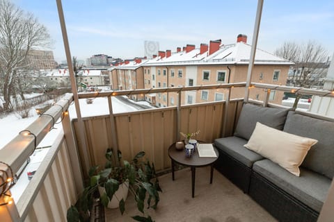 Balkongen i perfekt söderläge blir ett härligt extrarum stora delar av året. Här kan du njuta av solen från förmiddagen och långt in på eftermiddagen, oavsett om du vill dricka morgonkaffet, odla kryddor eller bjuda in till middagar under bar himmel.