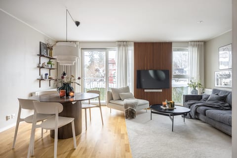 Det övre planet bjuder in med generösa sällskapsytor tack vare vardagsrum, matplats och kök i fil, allt med sydvästläge och sol fram till solnedgång. Härifrån når du även bostadens franska balkong med vyer över den charmiga villabebyggelsen runtom – en atmosfär som många efterfrågar men få får tillgång till. Köket är stilrent, modernt och välutrustat, med bland annat vinkyl, gott om förvaring och fönster mot innergården för en lugn kuliss.
